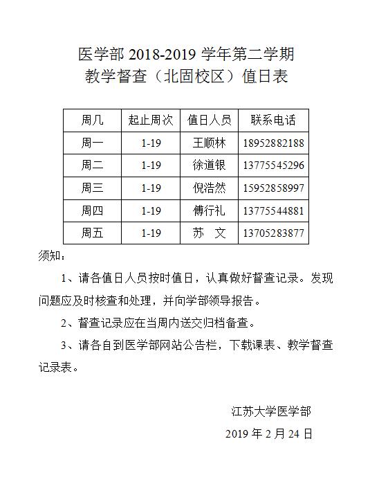 医学部2018-2019学年第二学期教学督查(北固校区)值日表